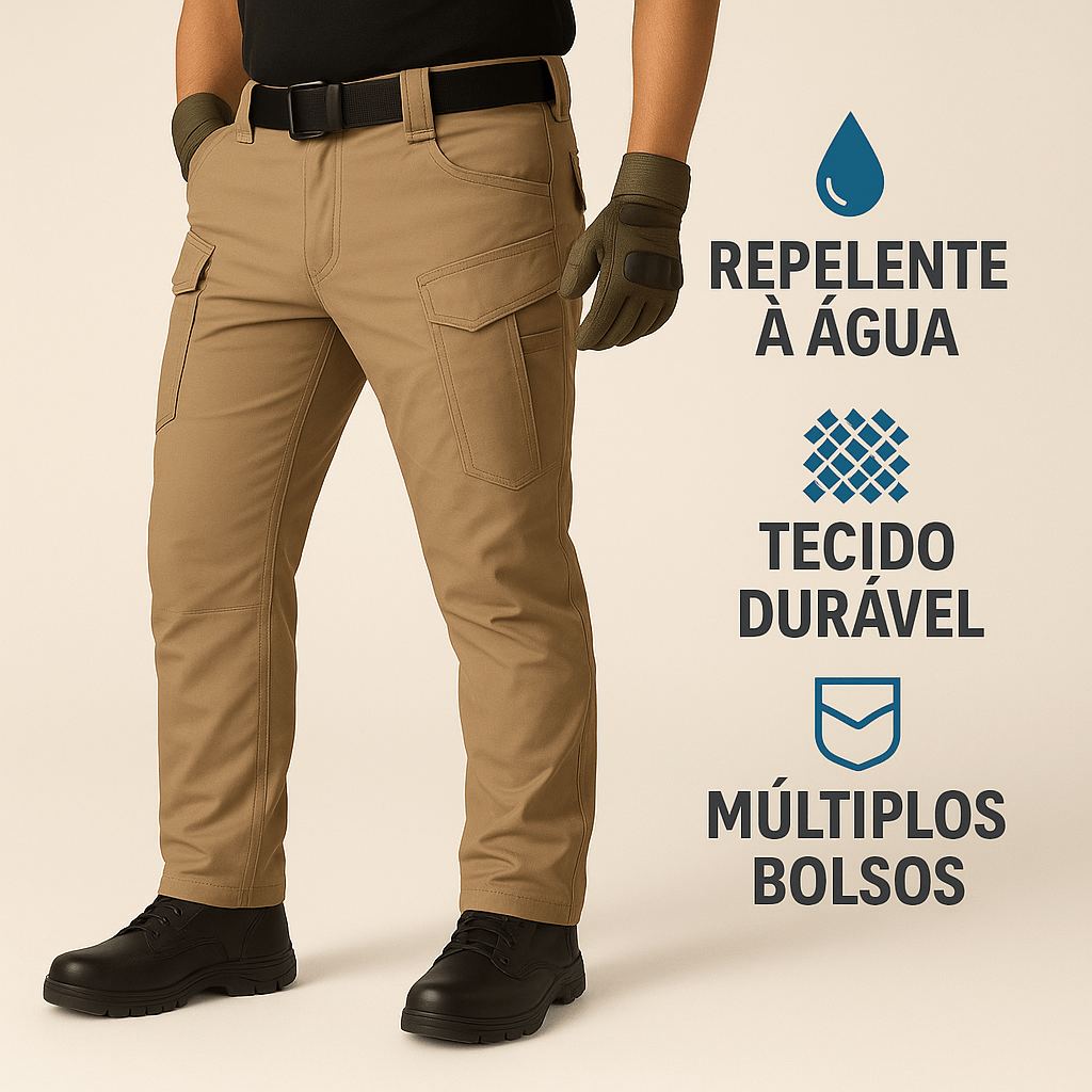A calça é fabricada em 100% Poliéster, com tecido altamente resistente a rasgos e impermeável, perfeito para atividades externas e trabalhos táticos.