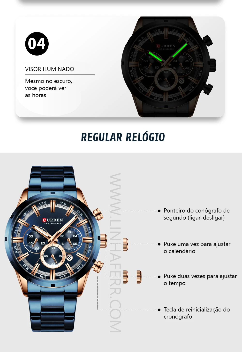 O Relógio Holands é original da marca CURREN, é um acessório de alta qualidade, super resistente a água e choques. Seus cronógrafos são funcionais, data automática, calendário completo e vários fusos horários, tornando-o funcional para uso e atividades diárias.